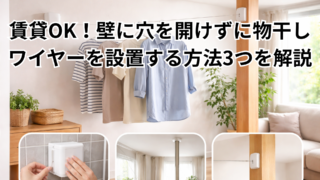 賃貸でも壁に穴を開けずに物干しワイヤーを設置する方法を解説。貼り付け・突っ張り・DIY柱の3つの選択肢と、壁材チェックや耐荷重・落下対策のポイントを初心者向けにまとめました。